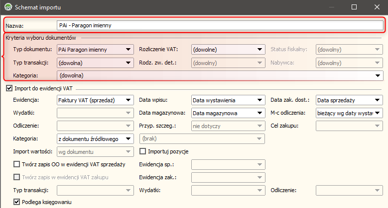 2. W oknie, które się wyświetli określić Nazwę schematu i jego kryteria wyboru dokumentów. Kryteriami wyboru dokumentów są właściwości dokumentu, po których dokument będzie automatycznie księgowany/ewidencjonowany w KPiR i Ewidencji VAT. Kryteria do określenia to: