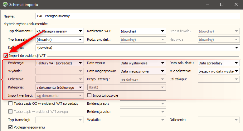 - Kategoria – czy kategoria zapisu VAT ma być zaimportowana z dokumentu źródłowego (paragonu) czy ma być ręcznie wskazana ze słownika kategorii,