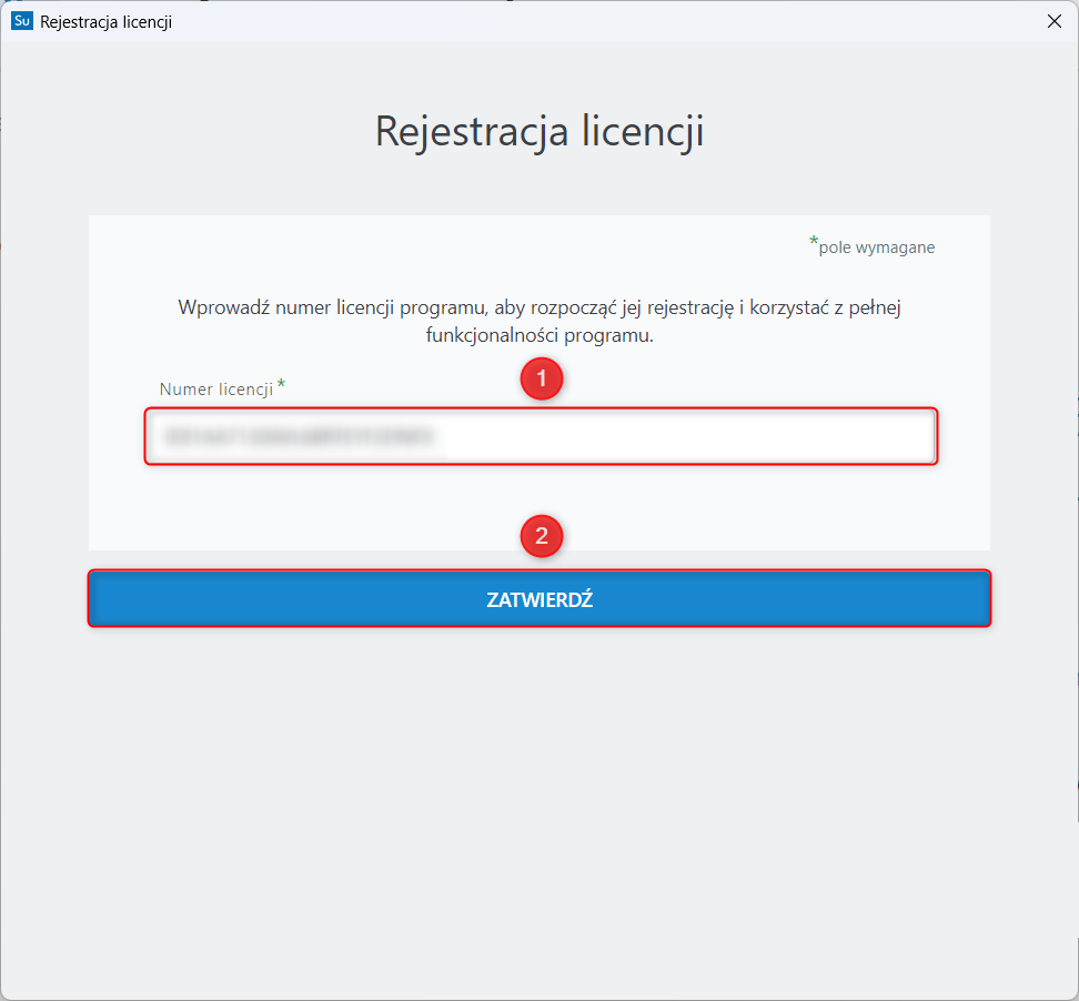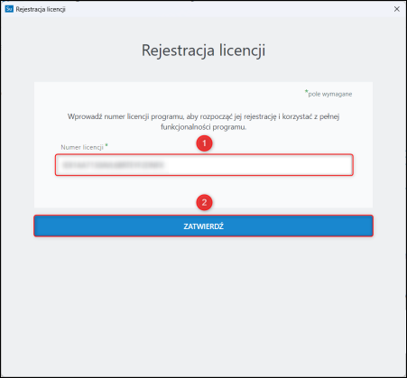 12. Podać posiadany Numer licencji i kliknąć Zatwierdź.