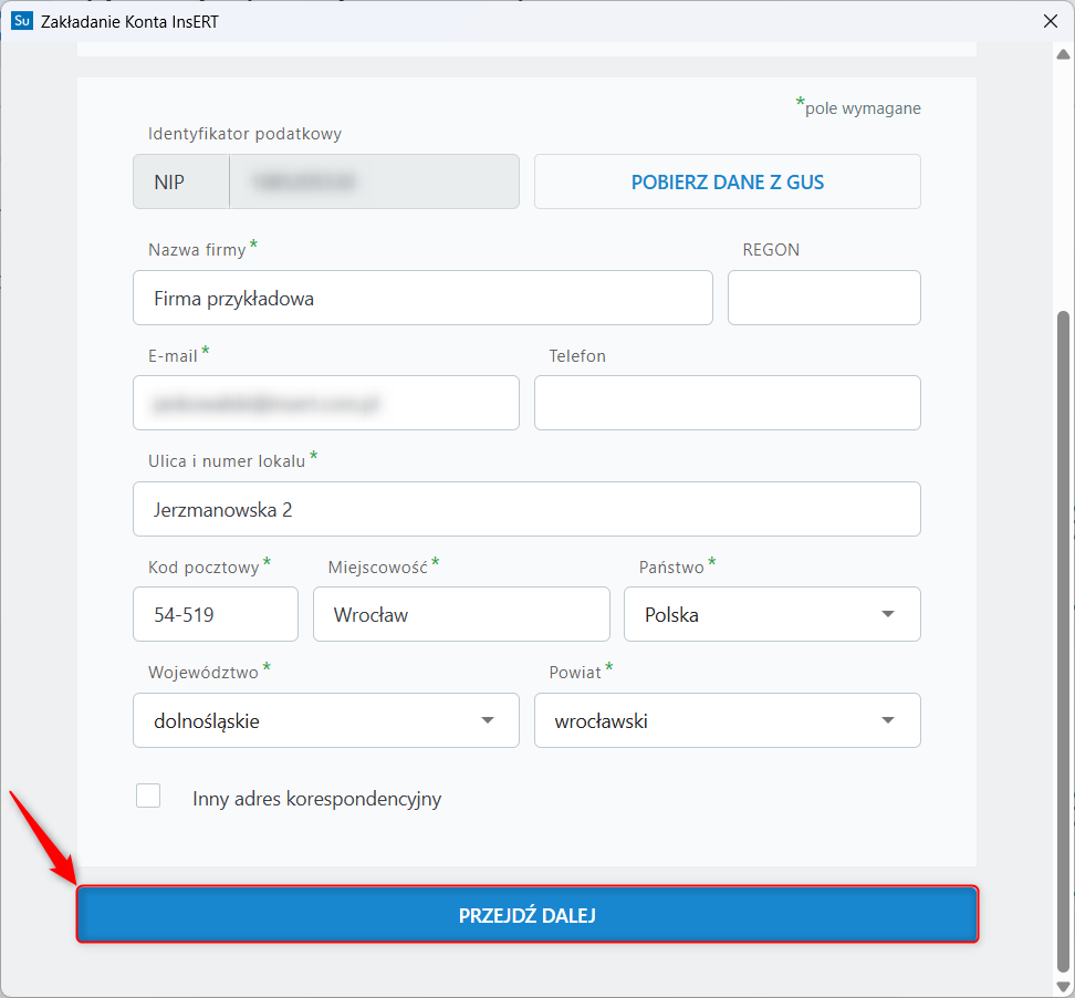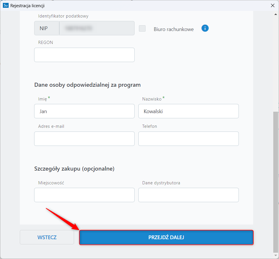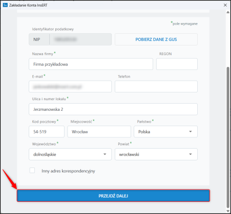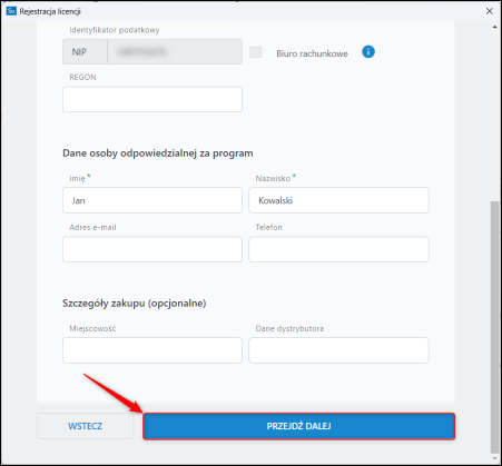 5. Wprowadzić dane firmy, a następnie Przejść dalej.