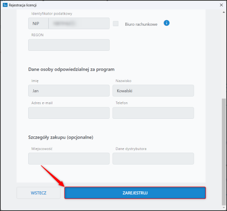 16. Zweryfikować wprowadzone informacje, a następnie zatwierdzić je przyciskiem Zarejestruj.