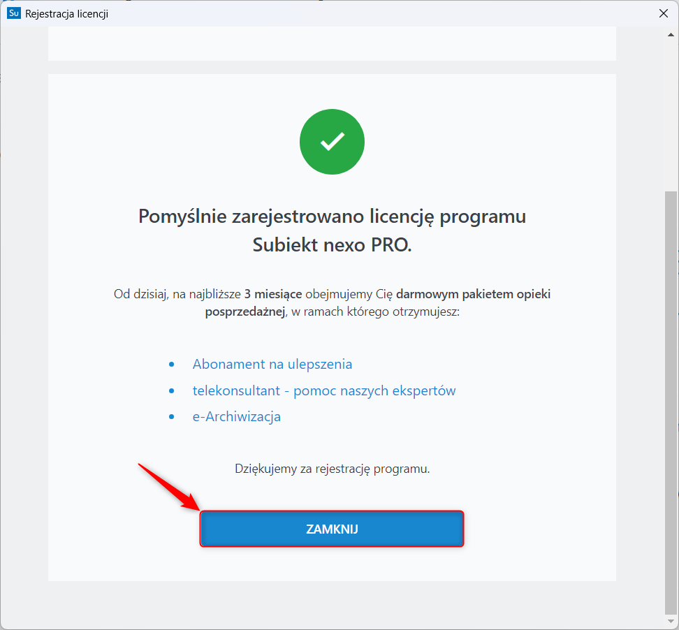17. Wyświetlona zostanie informacja o rejestracji licencji programu. Kliknąć Zamknij.