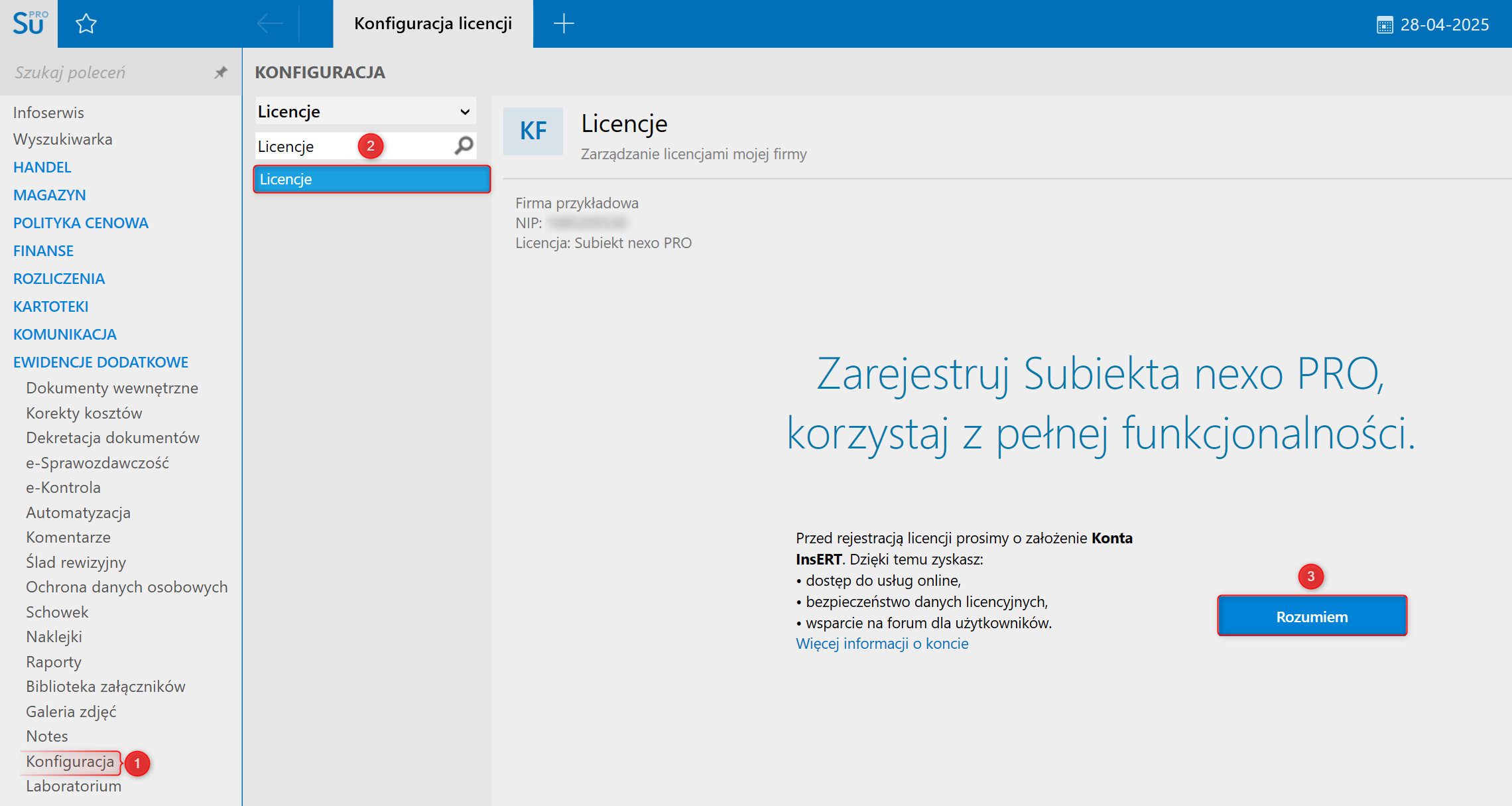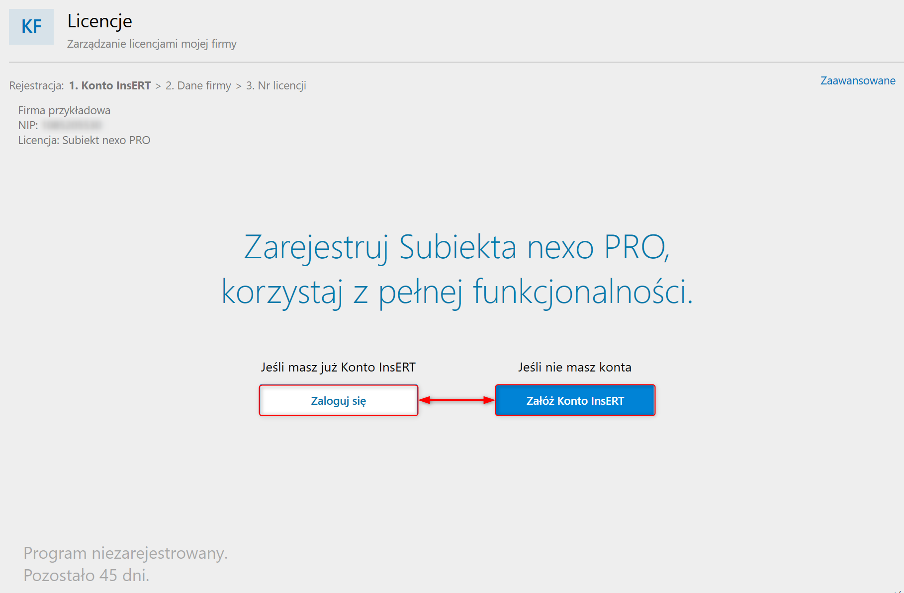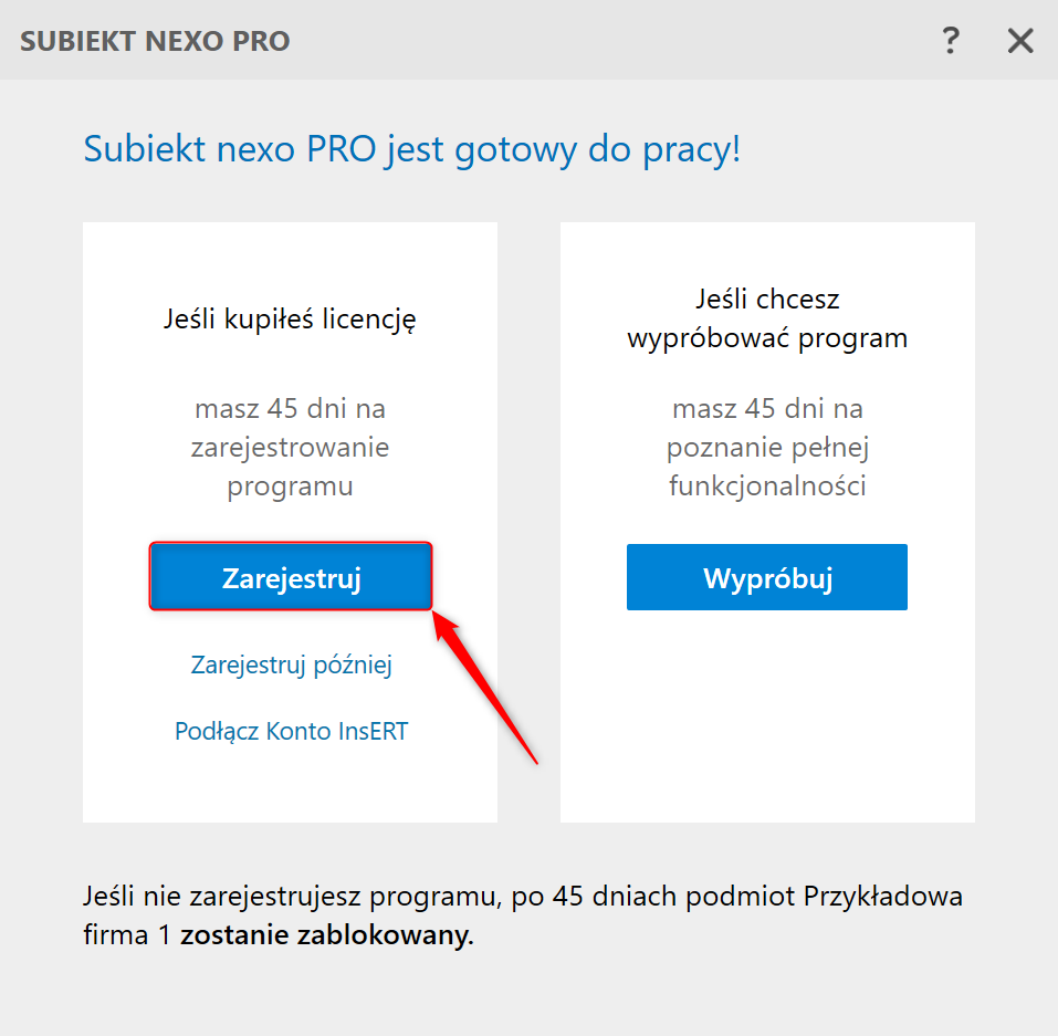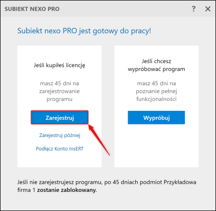 Aby rozp​ocząć pierwszą rejestrację licencji InsERT nexo (na przykładzie programu Subiekt nexo PRO), należy: