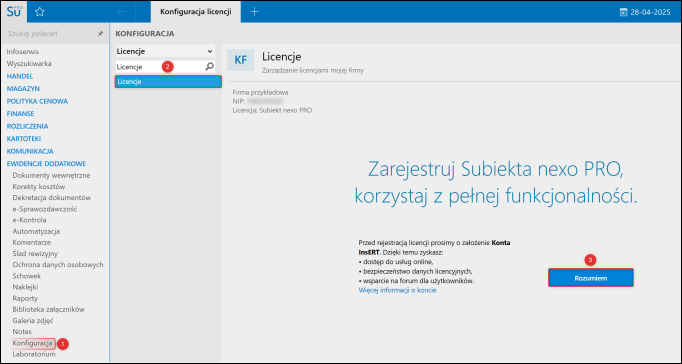 2. Alternatywnie, jeżeli podmiot został już wcześniej uruchomiony, przejść do KonfiguracjiLicencje, zapoznać się z komunikatem i kliknąć Rozumiem.