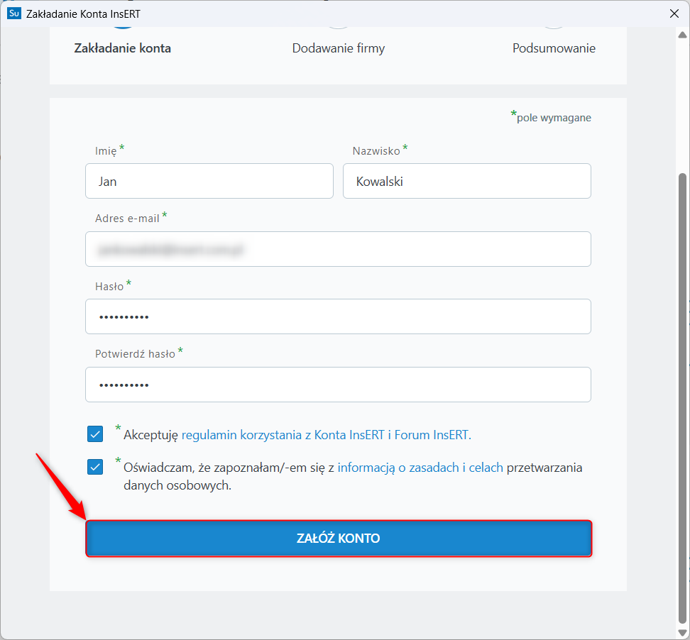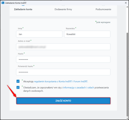 4. Uzupełnić podstawowe dane, zaakceptować regulamin i oświadczenie. Kliknąć Załóż Konto.