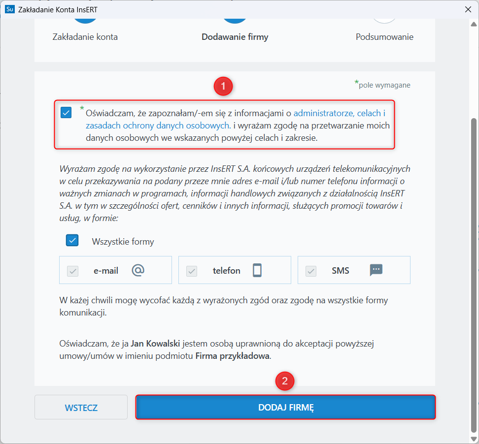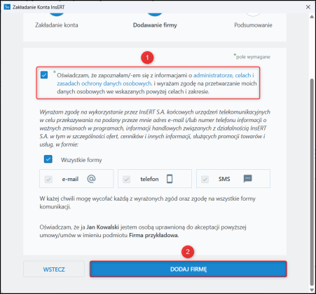 6. Zapoznać się i zaakceptować wymagane oświadczenie. Przejść dalej przy pomocy przycisku Dodaj firmę.