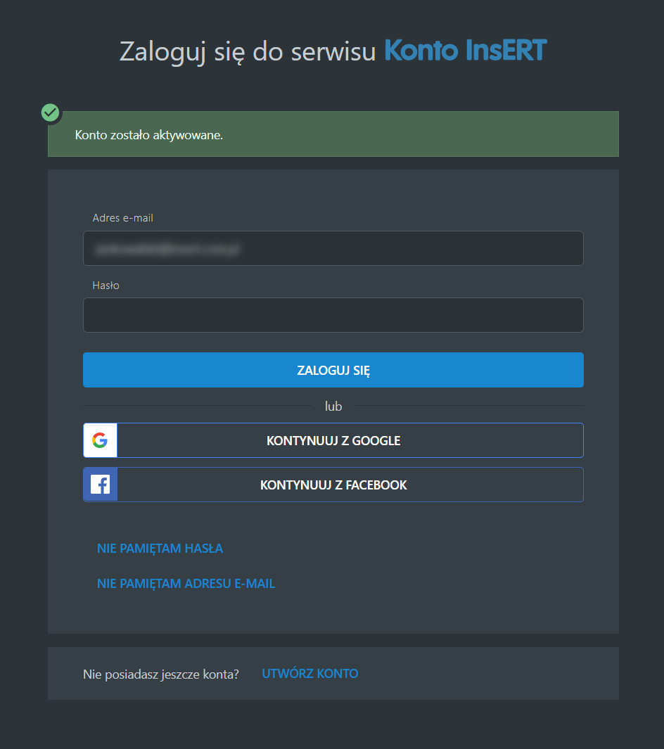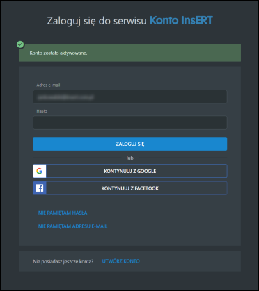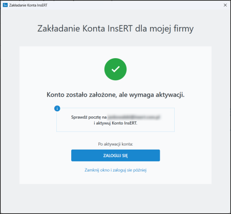 7. Wyświetlona zostanie informacja o założeniu Konta InsERT. Na podany adres e-mail przesłany zostanie link aktywacyjny.