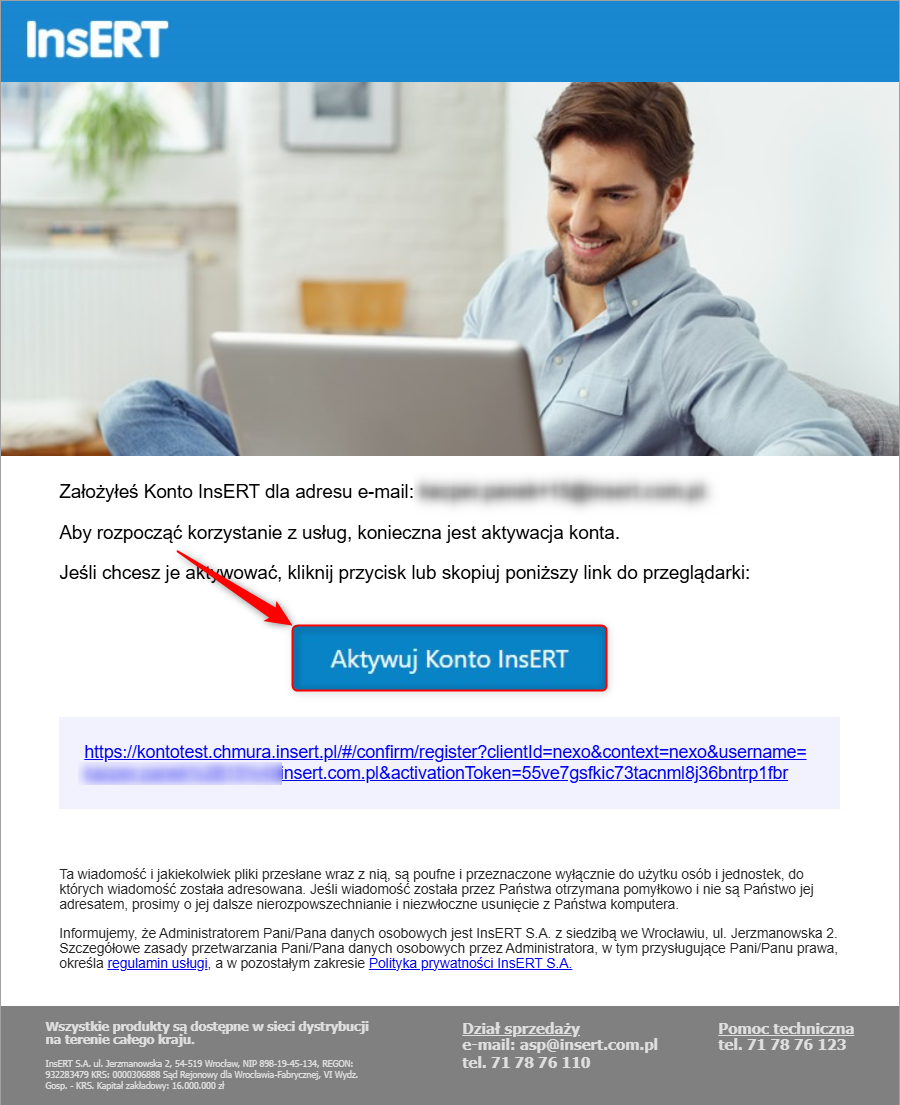 8. Po zalogowaniu się do skrzynki e-mail i odnalezieniu wiadomości aktywacyjnej kliknąć Aktywuj Konto InsERT.