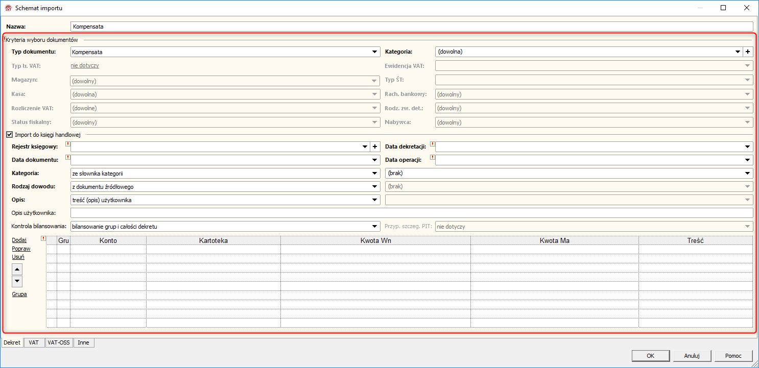 Dodatkowo należy zaznaczyć znacznik Import do księgi handlowej i wypełnić parametry dekretu – do jakiego Rejestru księgowego ma być dodany, jego Kategorię, Rodzaj dowodu, Daty i wybrać, w jaki sposób dekret ma być bilansowany.