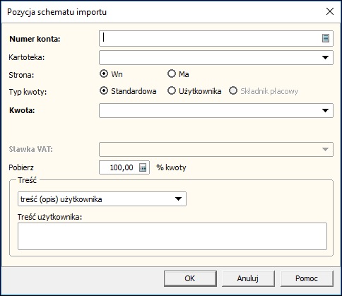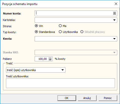 W przypadku problemów ze zrozumieniem którejś z funkcji należy skorzystać z zakładki Pomoc, w której znajduje się dokładny opis każdego z pól. Aby otworzyć Pomoc, należy w oknie dodawania schematu importu nacisnąć klawisz F1.
