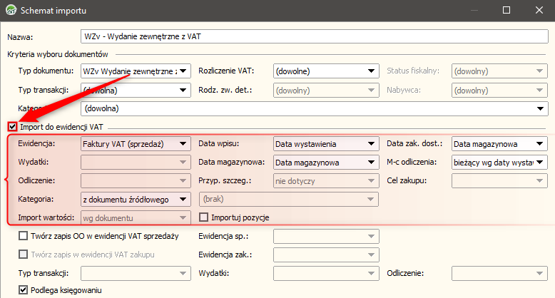 - Kategoria – czy kategoria zapisu VAT ma być zaimportowana z dokumentu źródłowego (wydania zewnętrznego z VAT) czy ma być ręcznie wskazana ze słownika kategorii,