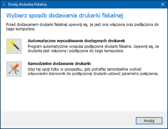 2. Wybrać, czy drukarki mają zostać wykryte automatycznie, czy samodzielnie dodane przez użytkownika.
