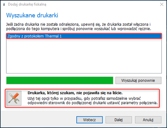 3. Wyszukiwanie automatyczne pokazuje na liście wszystkie znalezione przez niego drukarki. Zaznaczyć wykrytą drukarkę i przejść Dalej. W przypadku, gdy podłączona drukarka nie została znaleziona, istnieje możliwość ręcznego dodania konfiguracji urządzenia. W tym celu należy wybrać opcję Drukarka, której szukam, nie pojawiła się na liście.
