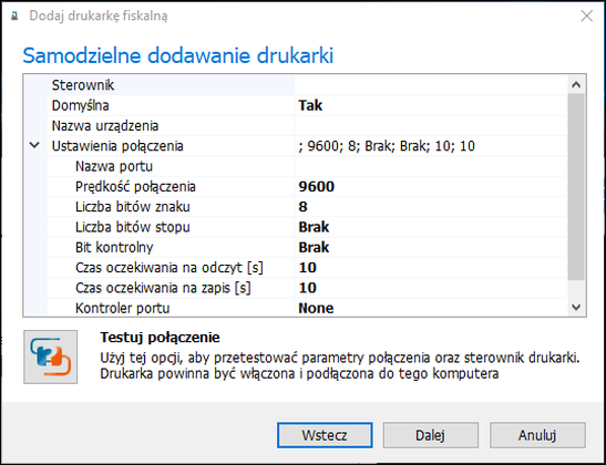 4. Wpisać ustawienia połączenia z drukarką fiskalną i przejść Dalej.