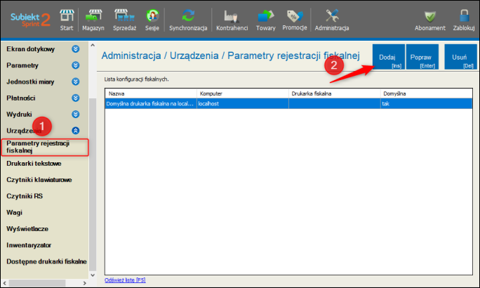7. Przejść do Parametrów rejestracji fiskalnej i kliknąć Dodaj.