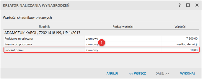 Ostatnim krokiem jest wyliczenie Listy płac, która w odpowiednim momencie wyświetli Składniki płacowe, w tym procent premii, który będzie można uzupełnić ręcznie.