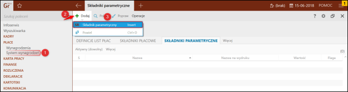 1. W module System wynagrodzeń przejść do zakładki Składniki parametryczne rozwinąć górne menu Dodaj i wybrać Składnik parametryczny.