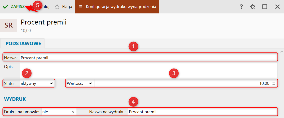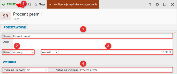 2. Uzupełnić Nazwę, ustawić Status jako Aktywny i wpisać domyślną Wartość procentową, która będzie się podpowiadać. Opcjonalnie można uzupełnić Opis, wybrać, czy Składnik płacowy ma być widoczny na wydruku umowy i jeśli ma się drukować, określić jego Nazwę na wydruku. Tak stworzony Składnik parametryczny należy zatwierdzić przyciskiem Zapisz.