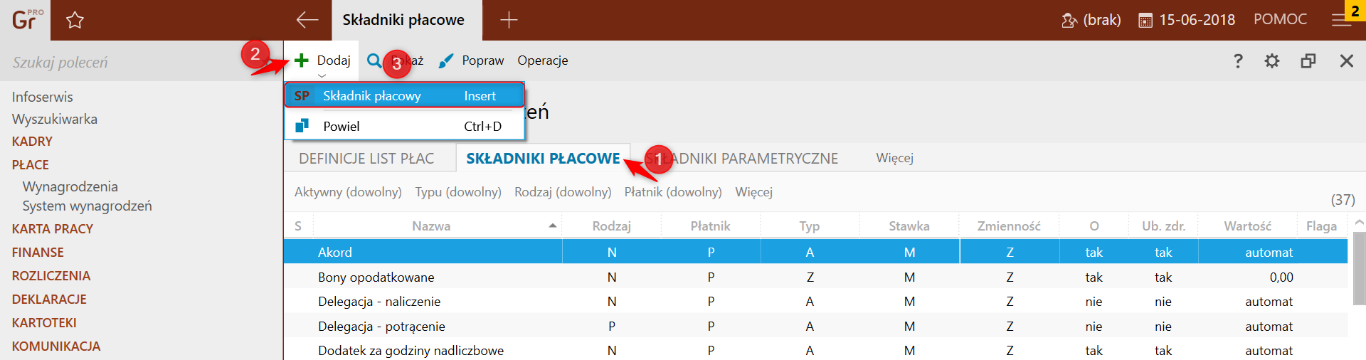3. Przejść na zakładkę Składniki płacowe, rozwinąć górne menu Dodaj i wybrać Składnik płacowy.