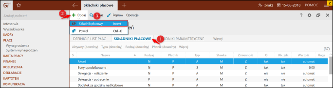 Przed dodaniem Premii procentowej na podstawie składnika parametrycznego, której wartość będzie można ustalać przy tworzeniu każdej Listy płac, należy wcześniej przygotować kilka składników płacowych. Aby to zrobić, należy: