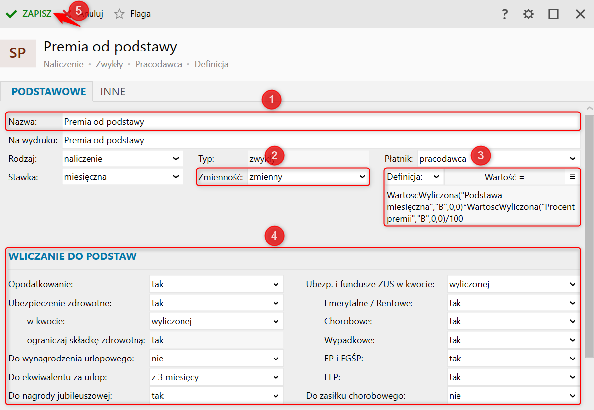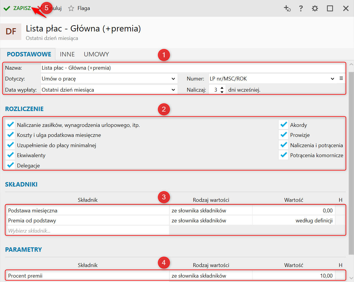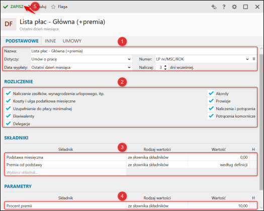 2. Uzupełnić dane podstawowe, w sekcji Rozliczenie zaznaczyć, co rozliczać ma Lista płac, w sekcji Składniki dodać premię od podstawy i składnik powiązany z nim, a w sekcji Parametry – Składnik parametryczny procent premii. Zmiany należy zatwierdzić przyciskiem Zapisz.
