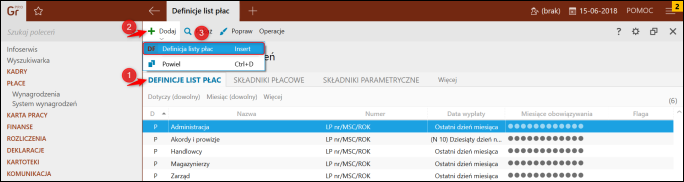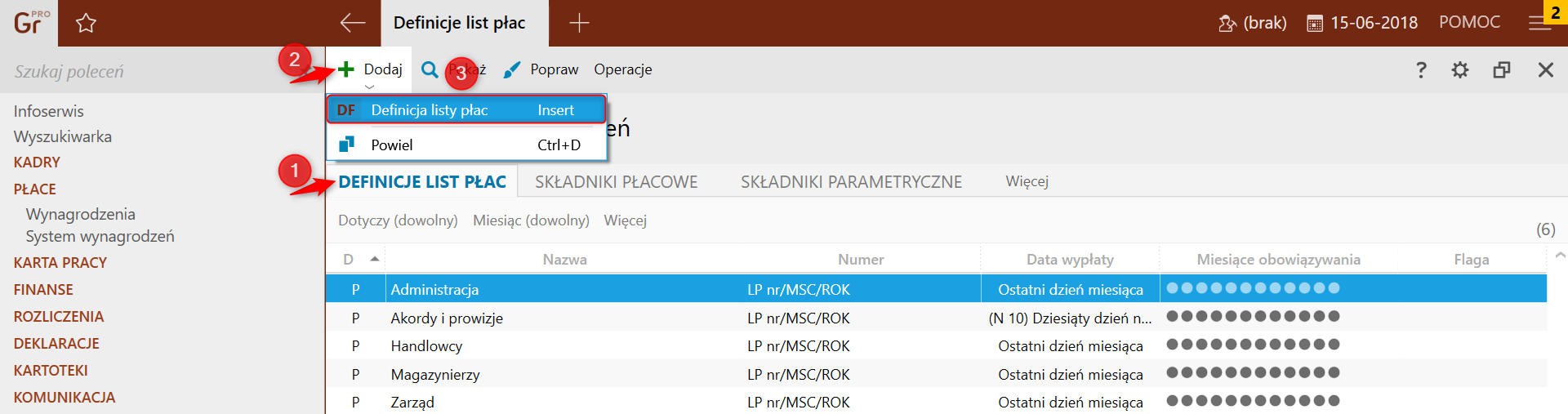 1. Przejść na zakładkę Definicje listy płac, rozwinąć górne menu Dodaj i wybrać Definicja listy płac.