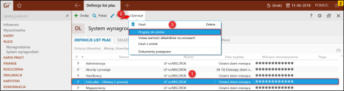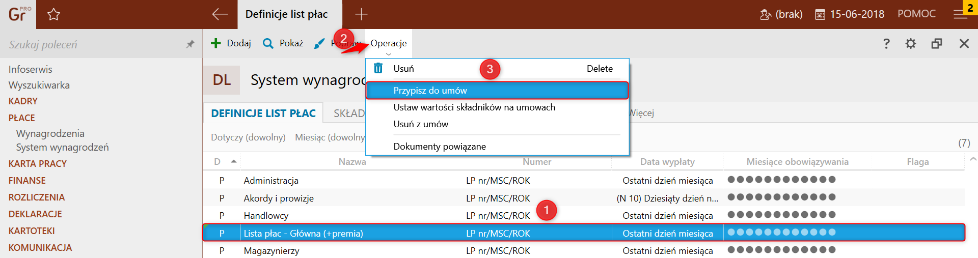 3. Po zaznaczeniu (w tym przypadku) nowo stworzonej Definicji listy płac, rozwinąć górne menu Operacje i wybrać Przypisz do umów.