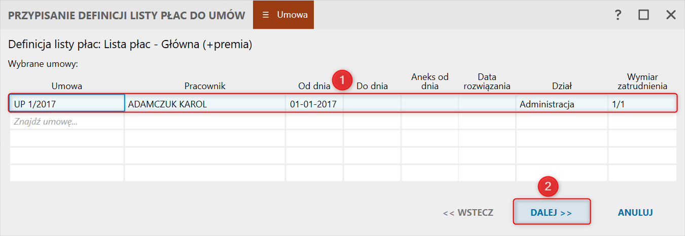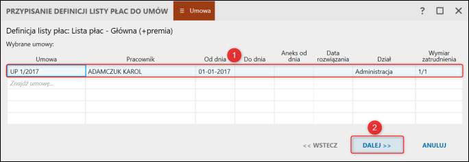 4. W pierwszym kroku kreatora Przypisywaniu definicji listy płac do umów wybrać umowy (gdzie po zaznaczeniu pola w kolumnie Umowa warto skorzystać z klawisza F2, będzie, któremu będzie można wybrać umowy zbiorczo) i kliknąć przycisk Dalej.