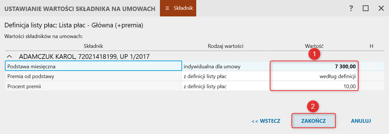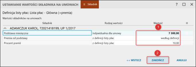 5. Upewnić się, czy w kolumnie Wartość są wszystkie kwoty i wartości wpisane poprawnie, po czym zakończyć kreator Przypisywania definicji listy płac do umów przyciskiem Zakończ.