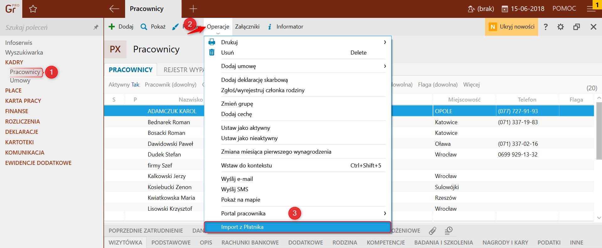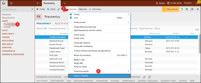 Kreator wczytywania plików KEDU z programu Płatnik do programu Gratyfikant nexo umożliwia zaimportowanie danych pracowników. Operację można wykonać w trakcie pracy z programem Gratyfikant nexo. Jest ona dostępna w module Pracownicy, wystarczy jedynie, rozwijając górne menu Operacje kliknąć Importu z Płatnika.