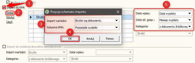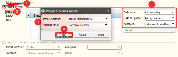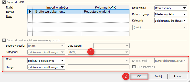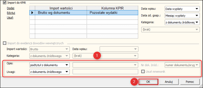 3. Następnie, żeby mógł się stworzyć zapis w Książce Przychodów i Rozchodów należy zaznaczyć Import do KPiR. Używając przycisku Dodaj wskazać, która wartość i do jakiej kolumny ma być wpisana do KPiR. Następnie określić jakie daty z dokumentu mają być potraktowane jako Data wpisu, Data zdarzenia gospodarczego w KPiR oraz z jaką Kategorią ma się stworzyć ten zapis.