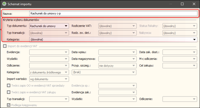 2. W oknie, które się wyświetli określić Nazwę schematu i jego kryteria wyboru dokumentów. Kryteriami wyboru dokumentów są właściwości dokumentu, po których dokument będzie automatycznie księgowany/ewidencjonowany w KPiR i Ewidencji VAT. Kryteria do określenia to: