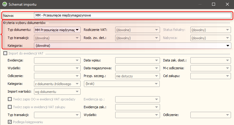 2. W oknie, które się wyświetli określić Nazwę schematu i jego kryteria wyboru dokumentów. Kryteriami wyboru dokumentów są właściwości dokumentu, po których dokument będzie automatycznie księgowany/ewidencjonowany w KPiR i Ewidencji VAT. Kryteria do określenia to: