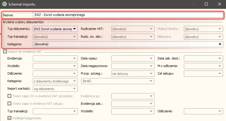 2. W oknie, które się wyświetli określić Nazwę schematu i jego kryteria wyboru dokumentów. Kryteriami wyboru dokumentów są właściwości dokumentu, po których dokument będzie automatycznie księgowany/ewidencjonowany w KPiR i Ewidencji VAT. Kryteria do określenia to:
