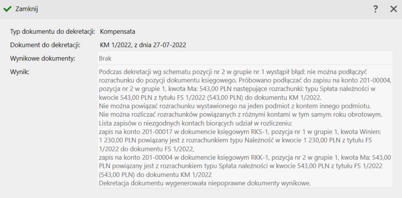 Częstym problemem użytkowników jest dekretowanie dokumentów kompensaty na innego konto, niż dokumenty kompensowane np. FS została zadekretowana na konto 201 odbiorcy, a spłata należności jest dekretowana na konto 202 dostawcy na podstawie stworzonego schematu dekretacji.