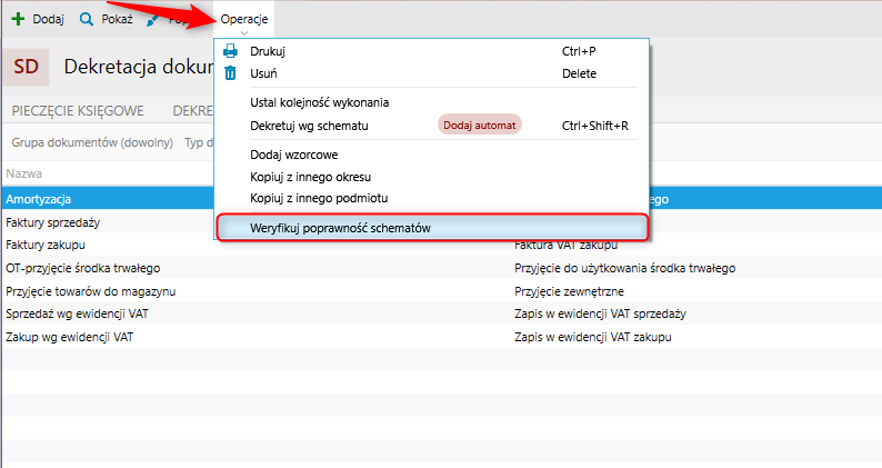 Operacja jest przeznaczona dla takich schematów, które zostały przeniesione z innych okresów lub innych podmiotów, a jednocześnie zmienił się charakter księgowania danych operacji gospodarczych, np. mógł się zmienić plan kont (konto ujęte w definicji kopiowanego schematu nie występuje w bieżącym okresie, wtedy program po weryfikacji poinformuje o tym, że schemat jest niepoprawny).