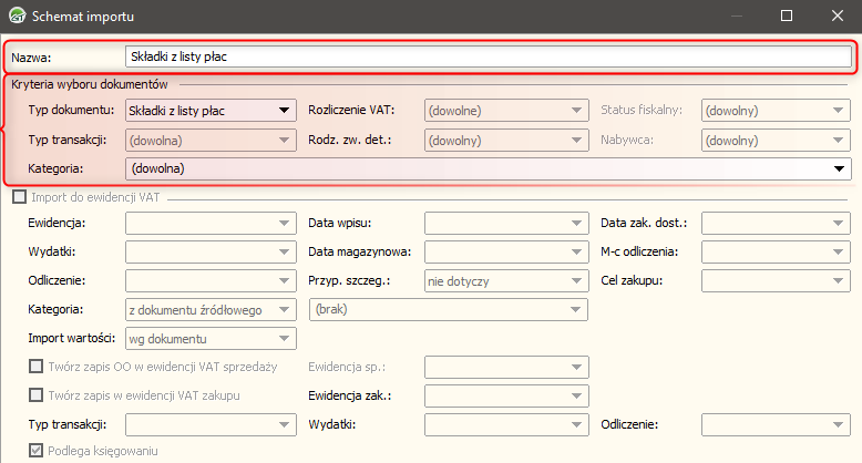 2. W oknie, które się wyświetli określić Nazwę schematu i jego Kryteria wy​boru dokumentów. Kryteriami wyboru dokumentów są właściwości dokumentu, po których dokument będzie automatycznie księgowany/ewidencjonowany w KPiR i Ewidencji VAT. Kryteria do określenia to: