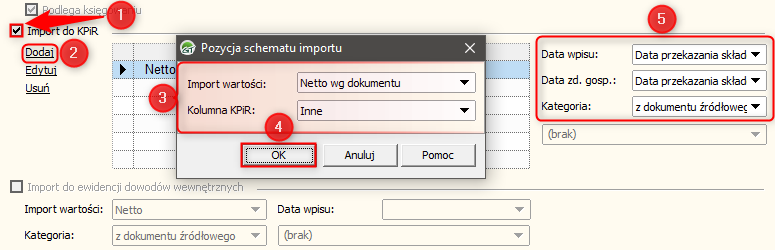 3. Następnie, żeby mógł się stworzyć zapis w Książce Przychodów i Rozchodów, należy zaznaczyć Import do KPiR. Używając przycisku Dodaj wskazać, która wartość i do jakiej kolumny ma być wpisana do KPiR. Następnie określić jakie daty z dokumentu mają być potraktowane jako Data wpisuData zdarzenia gospodarczego w KPiR oraz z jaką Kategorią ma się stworzyć ten zapis.
