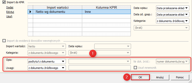 4. Następnym krokiem jest określenie, co z dokumentu ma się zaimportować w pola Opis i Uwagi. Po wykonaniu wszystkich czynności schemat zapisać klikając przycisk OK.