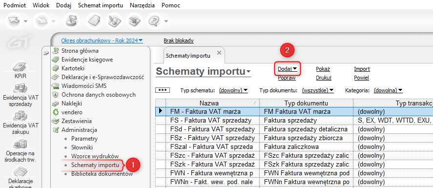 1. Z listy modułów wybrać Administracja – Schematy importu, a następnie kliknąć przycisk Dodaj.