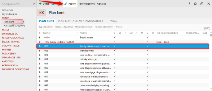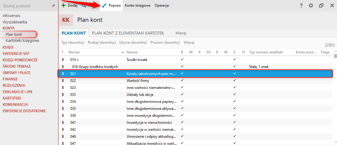 1. Przejść do modułu Plan kont. Zaznaczyć konto na liście i kliknąć Popraw na górnym pasku.