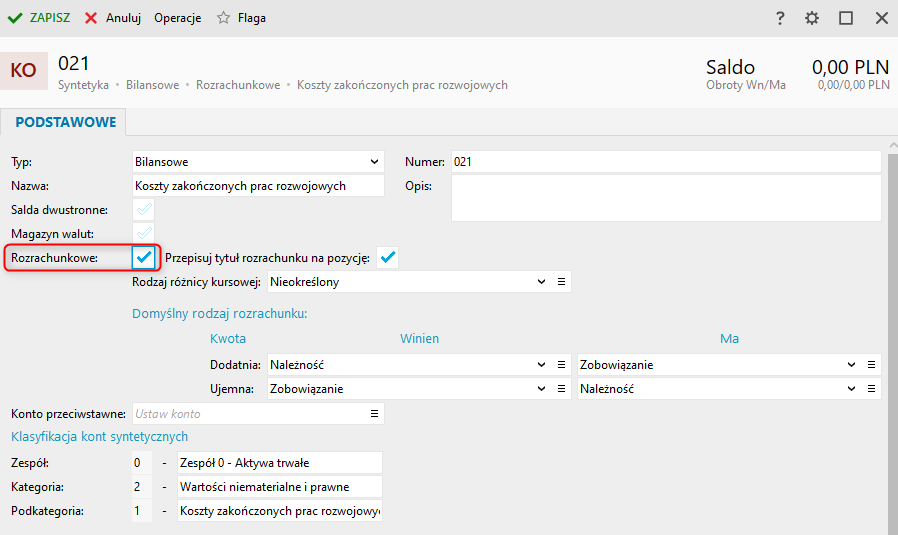 Uwaga! Kontami rozrachunkowymi mogą być jedynie konta bilansowe. Znacznik Rozrachunkowe można zaznaczyć tylko dla konta syntetycznego. Konta analityczne danego konta syntetycznego dziedziczą to ustawienie. Operacja możliwa jest, gdy nie ma żadnych zapisów na żadne konto związane z tą syntetyką.