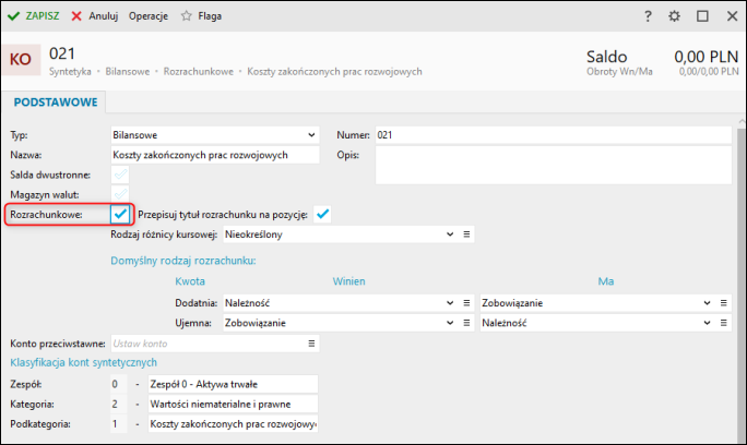Nadanie tego atrybutu syntetyce powoduje, że każdy zapis dokonywany na to konto księgowe będzie musiał mieć swoje odzwierciedlenie w rozrachunkach firmy. Jest to żelazna reguła integralności danych księgowych, od której nie ma odstępstwa. Po ustawieniu aspektu rozrachunkowości konta syntetycznego użytkownik może wybrać domyślny rodzaj różnicy kursowej, jaka wynikać będzie z zapisów walutowych dokonywanych na to konto.
