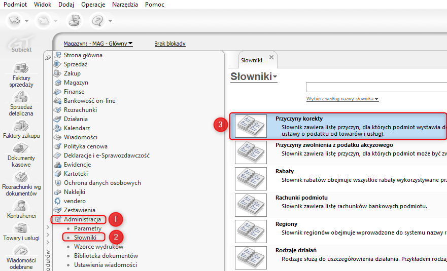 1. Z listy modułów wybrać Administracja  Słowniki i z listy słowników Przyczyny korekty.​