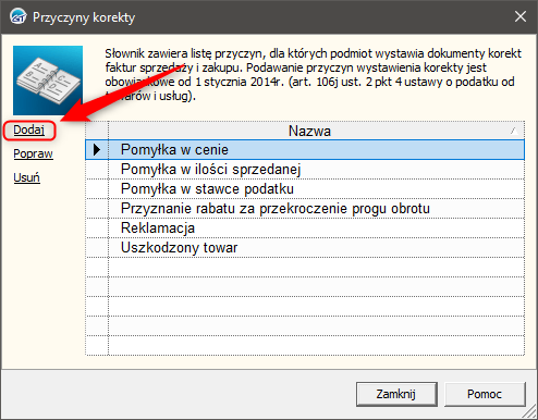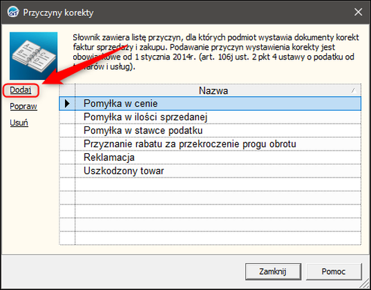 Aby dodać do programu Subiekt GT własną przyczynę korekty, należy: