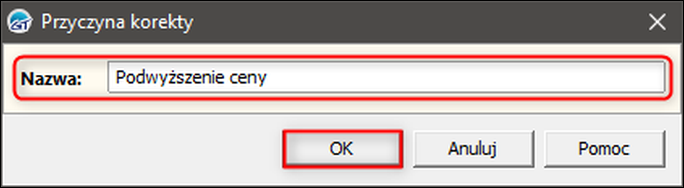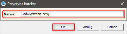 3. W następnym oknie w polu Nazwa wprowadzić nową przyczynę korekty. Nową przyczynę zapisać klikając przycisk OK.