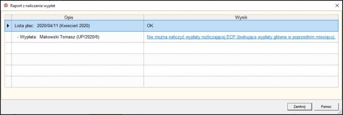 Komunikat "Nie można naliczyć wypłaty rozliczającej ECP" oznacza, że w poprzednim okresie nie zostały wyliczone wszystkie wypłaty główne (takie, które rozliczają ewidencje czasu pracy ECP). Należy najpierw wyliczyć wszystkie wypłaty główne w poprzednim okresie i dopiero naliczyć wypłaty za bieżący miesiąc.