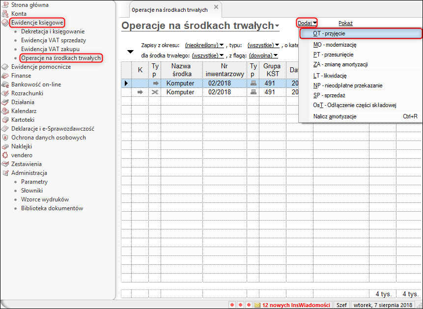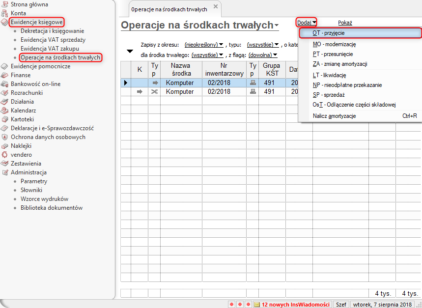 Aby przyjąć środek trwały dokumentem OT, należy wcześniej w programie dodać kartotekę środka trwałego. Osobny artykuł na ten temat dostępny jest tutaj. Po skonfigurowaniu kartoteki środka trwałego, należy: