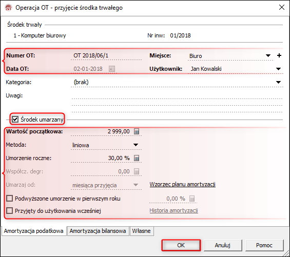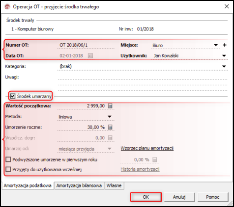 3. W oknie Operacja OT – przyjęcie środka trwałego, należy uzupełnić numer OT, datę OT (faktyczna data przyjęcia środka trwałego), miejsce (MPK) oraz użytkownika. Opcjonalnie określić jego kategorię i dopisać uwagi. W przypadku, gdy środek trwały ma być amortyzowany, zaznaczyć pole Środek umarzany, a następnie określić parametry jego amortyzacji.