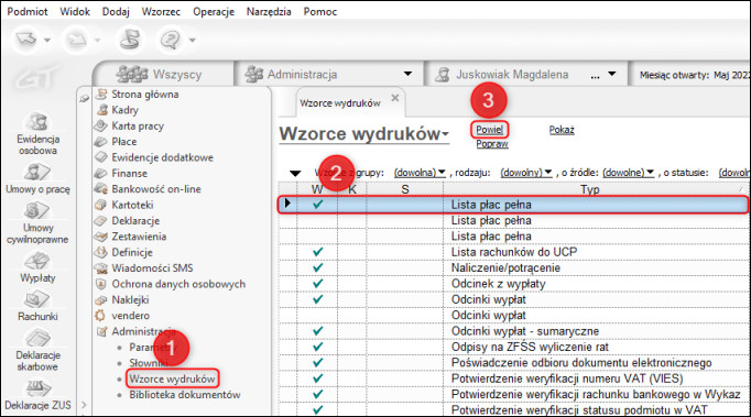 1. Przejść do modułu Administracja – Wzorce wydruków, na liście odnaleźć wzorzec o nazwie Lista płac pełna i utworzyć jego duplikat przy użyciu przycisku Powiel (dostępny zarówno w górnej części tabeli, jak i pod prawym przyciskiem myszy).